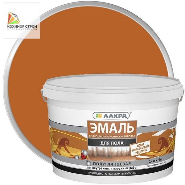 Водно-дисперсионная акриловая эмаль для пола ЛАКРА - это многофункциональное покрытие, предназначенное для защиты и декоративного оформления напольных поверхностей. Она создана на основе акриловых смол, которые обеспечивают высокую степень адгезии и прочности покрытия. Быстро высыхает. Образует полуглянцевую поверхность, стойкую к механическим воздействиям, влаге и истиранию. Отличается высокими декоративными и защитными свойствами, стойкая к мытью. Готова к применению. Применяется для окраски деревянных полов внутри и снаружи помещений, бетонных полов внутри бытовых помещений. Может применяться для окраски дверей, мебели и др. поверхностей внутри помещений.