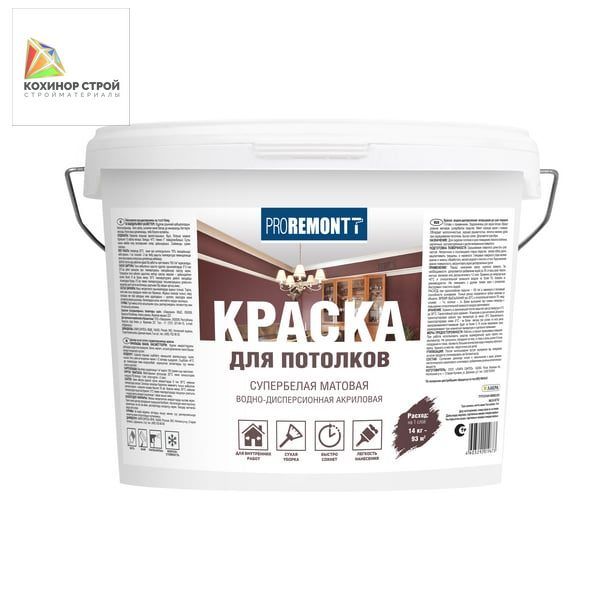 PROREMONTT супербелый является качественной краской для потолков, обеспечивающей гладкое и ровное покрытие, быстро высыхающее, экологически безопасное и при этом доступное по цене.