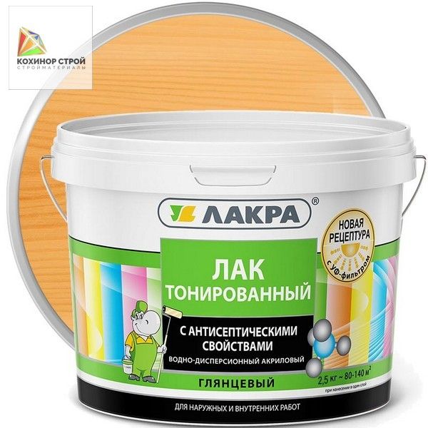 Лак тонированный водно-дисперсионный акриловый ЛАКРА - это качественное средство для тонирования и защиты деревянных поверхностей (плинтусов, вагонки, наличника, различных видов панелей), кроме полов, а также для внутренних работ по минеральным поверхностям (кирпич, бетон, керамика, природный камень). Применяется для наружных и внутренних работ. Он является водно-дисперсионным акриловым лаком, что означает, что он разбавляется водой и содержит акриловые полимеры.