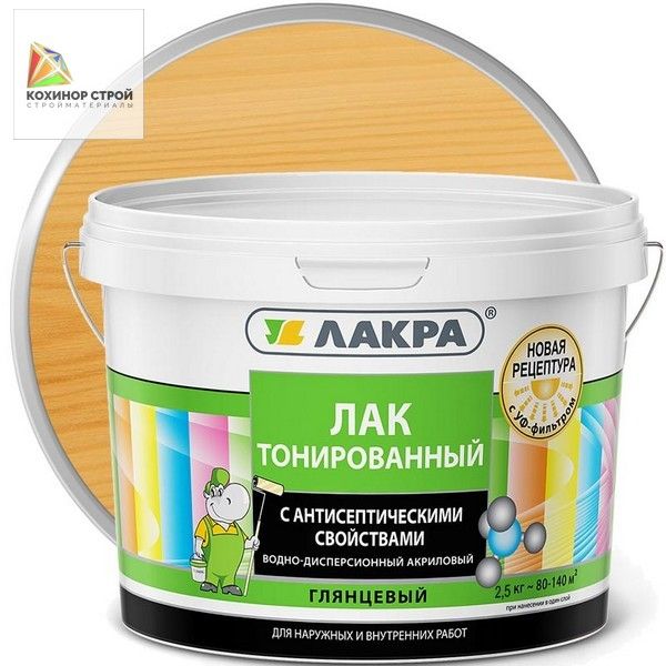 Лак тонированный водно-дисперсионный акриловый ЛАКРА - это качественное средство для тонирования и защиты деревянных поверхностей (плинтусов, вагонки, наличника, различных видов панелей), кроме полов, а также для внутренних работ по минеральным поверхностям (кирпич, бетон, керамика, природный камень). Применяется для наружных и внутренних работ. Он является водно-дисперсионным акриловым лаком, что означает, что он разбавляется водой и содержит акриловые полимеры.