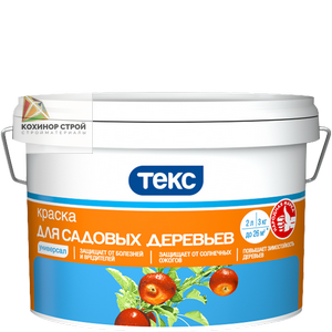 Краска для садовых деревьев Универсал ТЕКС - подходит для плодовых, декоративных деревьев, кустарников с целью повышения зимостойкости, предохранения их от солнечных ожогов и вредителей, а также закрашивания ран и спилов.